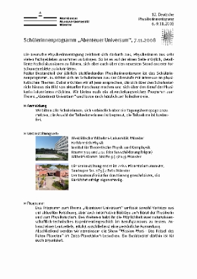 Am 7.11.2008 laden wir alle Schülerinnen der Oberstufe ein, am Fachbereich Physik der Uni Münster an der 12. Deutschen Physikerinnentagung teilzunehmen. Unter dem Motto „Abenteuer Universum“ wird euch ein abwechslungsreiches Programm geboten mit Vorträgen und Events – ganz wie bei den „großen“ Physikerinnen, die sich parallel vom 6.11.-9.11.2008 treffen und fachlich austauschen.