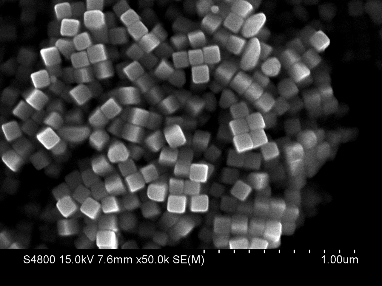 Abb.: REM-Aufnahme von Gold-Nanokuben mit Kantenlängen von etwa 120 nm.